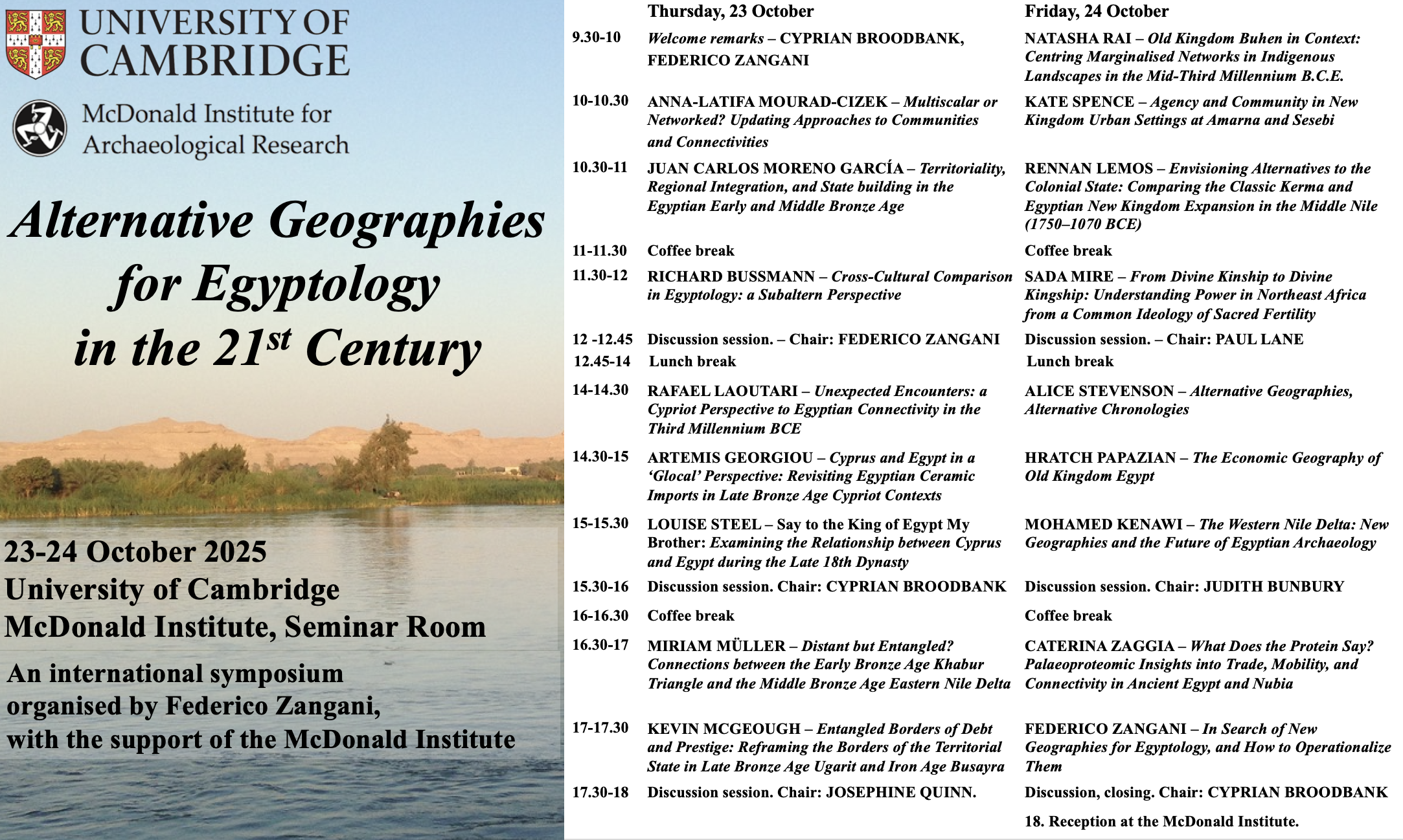 The conference will take place in the seminar room of the McDonald Institute on 23-24 October. Attendance is free (up to full room capacity), but registration is required. If interested, please email Dr Federico Zangani by Monday, 13th October, specifying your dietary requirements.