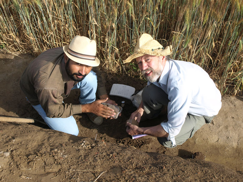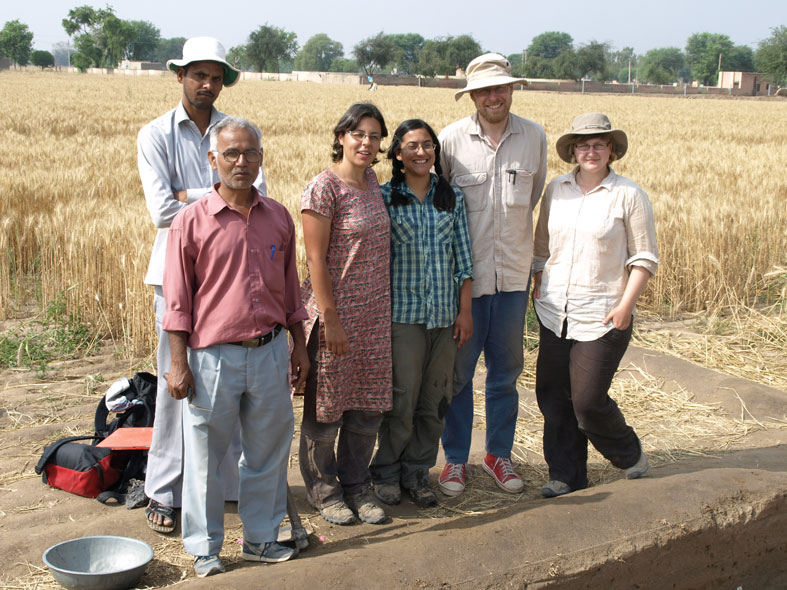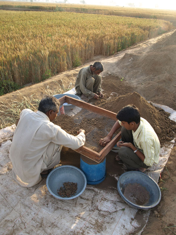 In order to gain a greater understanding of the surface and immediately subsurface geomorphology, a preliminary analysis of the environmental and landscape context of a range of archaeological sites in District Hanumangarh was carried out during the season. This saw a small team of researchers make assessments of the environmental and landscape context at Dabli vas Chugta and several other sites. This site margin survey work took the form of judgmentally placed test pits and hand auger profiles, as well as opportunistic findings of exposed and available sections, brick quarry pits, wells and water boreholes. At no point did this investigation intrude on land protected by the ASI. The primary objective of this work was to investigate the local soil and site-formation processes at each of these sites. At each profile loci, the stratigraphy was recorded and photographed, located and leveled in using a Leica GPS1200 differential GPS system, and old land surfaces sampled as appropriate.